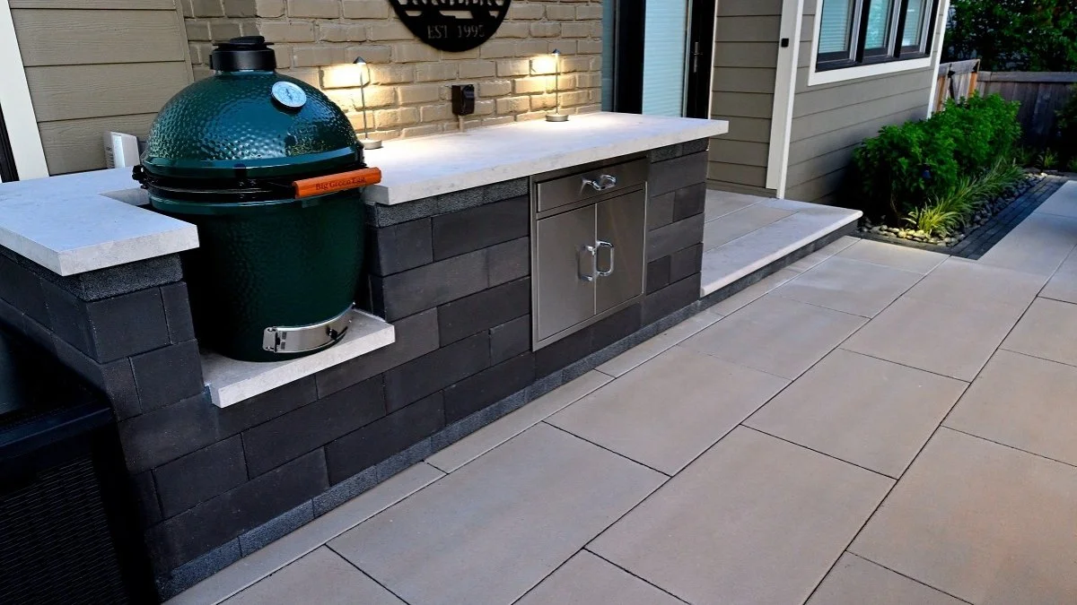 The next step of this project was to incorporate an outdoor kitchen into the patio. We installed it right along the house beside the door to their backyard, using dark blocks and a light-colored stone countertop to match the space's overall aesthetic. This kitchen also has stainless steel drawers and a grill so our client can cook meals while spending time in their outdoor living space.