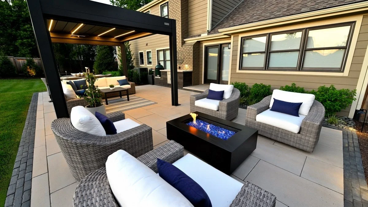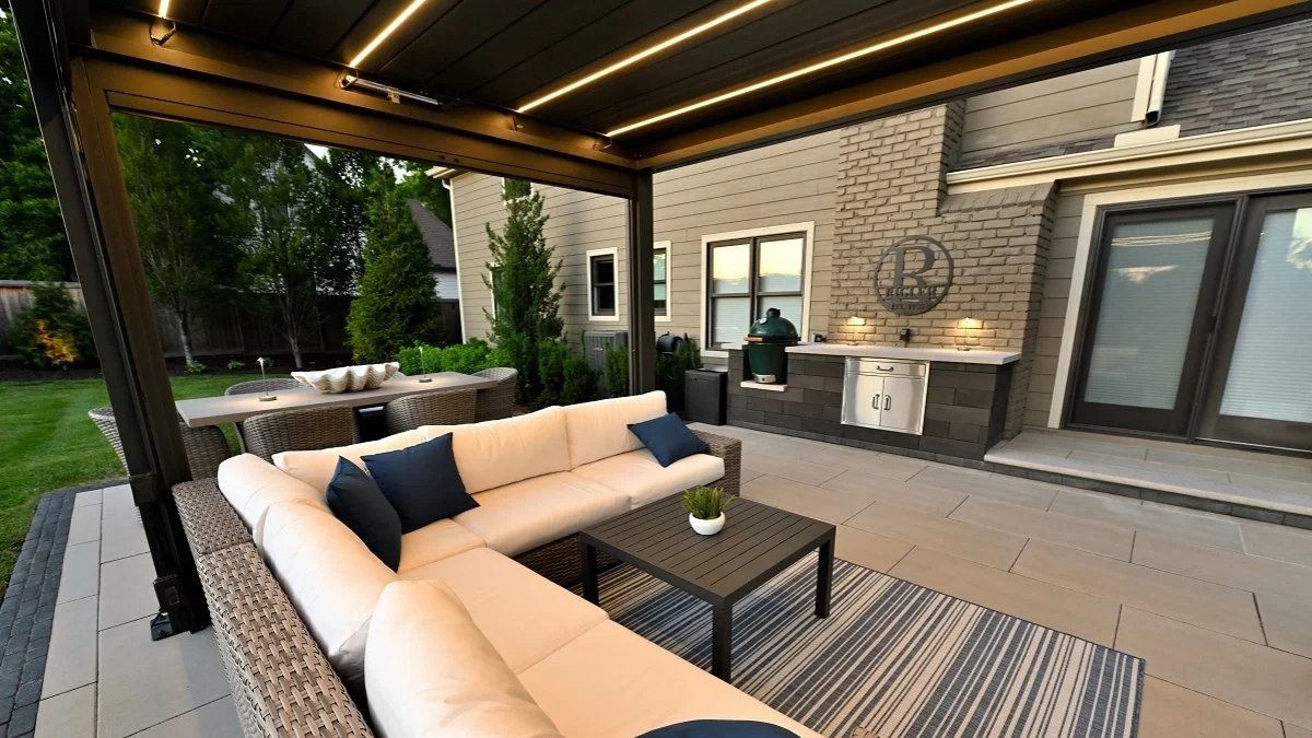 Upon finishing their new patio, we constructed a sleek, black fire pit and a metal pergola to match, creating a cohesive look among the features. Their pergola is highly sturdy, as it's secured into the patio, and boasts built-in lighting on the roof slats so our client can sit underneath it even after the sun goes down.